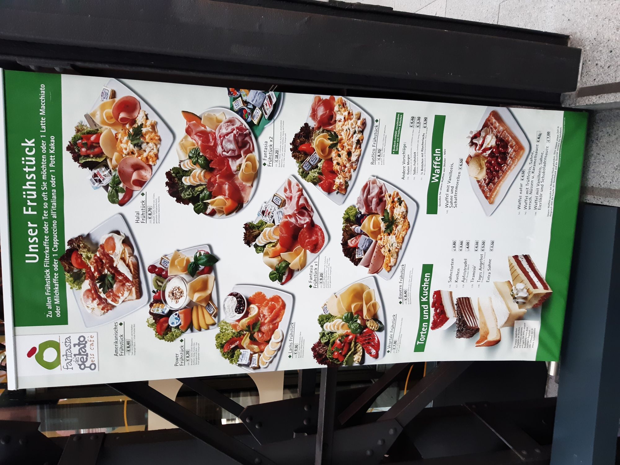 Im Eiscafe Fantasia in den Borsighallen gibt es sehr gute und günstige Frühstücksangebote. Zum Beispiel ist der Kaffee unbegrenzt inclusive. Ein Teil der Karte ist bei den Bildern zu sehen. Außerdem kann man dort gut klönen und lachen ! Niemand sitzt einem auf den Fersen und wartet, dass man "endlich den Tisch freimacht".